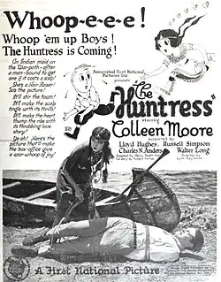 The Huntress is a 1923 American drama film directed by Lynn Reynolds and written by Percy Heath. It is based on the 1922 novel The Huntress by Hulbert Footner. The film stars Colleen Moore, Lloyd Hughes, Russell Simpson, Walter Long, C.E. Anderson, and Snitz Edwards. The film was released on August 20, 1923, by Associated First National Pictures.[1][2][3][4]