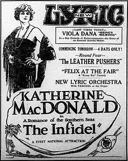 The Infidel is a 1922 American silent drama film written and directed by James Young and featuring Katherine MacDonald, Robert Ellis, Joseph Dowling and Boris Karloff. Young wrote the screenplay based on a story by Charles A. Logue. The film is considered to be lost.[1] The film's tagline was "Man-Bait! Sent out, willingly, to a Pacific Paradise where the world forgets. Sent there to wreck a two-fisted, fighting gentleman with her faithlessness... And instead wrecking her own heart with her own love." (Print Ad in the Flushing Daily Times, ((Flushing, NY)) 30 December 1922).