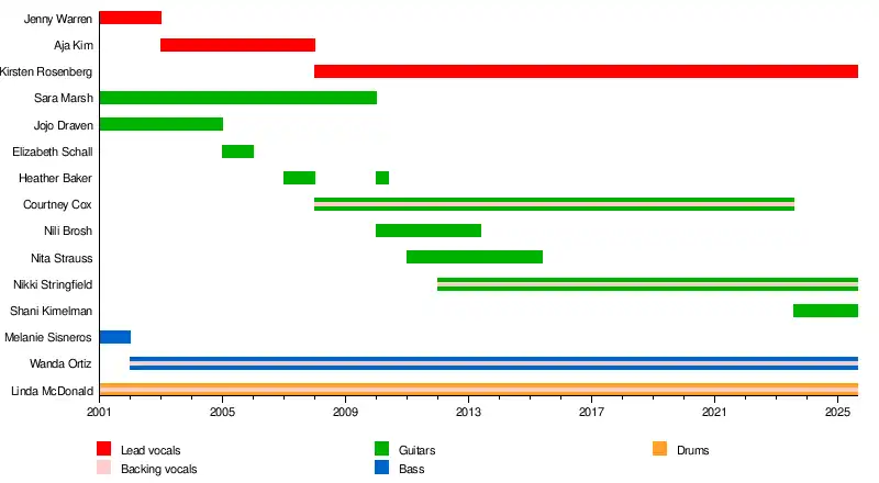 In summer 2008, Heather Baker and Aja Kim left the band to pursue solo careers.[10] The two were replaced by guitarist Courtney Cox and vocalist Kirsten Rosenberg (formerly of the Maryland-based cover band HighWire).[11] In January 2010, Marsh, who was ill, was taken off some of the Japanese tour shows and did not rejoin the band.[12] Baker rejoined the band to temporarily fill in Marsh's spot for a handful of shows.[12]