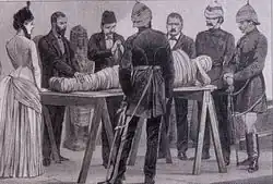 Egyptology and the fascination with ancient artifacts were echoed in nineteenth-century literature. Between 1860 and 1914, hundreds of stories about Egyptian mummies, curses, and exploration were published. Roger Luckhurst situates this within a cultural trend of what he calls Egyptian Gothic, "a set of beliefs or knowledges in a loosely occult framework" developed in response to British anxieties about the rule of Egypt.[6] One common plot in these narratives was the "Mummy’s Curse", which "follows the basic plot structure of misappropriation of tomb artifacts with fatal consequences following the protagonist home and features the explicit warning 'beware of the Mummy’s Curse'";[7] often these artifacts were possessed by some supernatural element. Mummies were often the focal point of these stories, usually of noble rank, because most of the mummies being discovered in the nineteenth century were pharaohs. There was an emphasis on the idea of perfect preservation and beauty; mummies were unravelled at museum exhibitions in British museums, and audiences were amazed by their "almost perfect condition".[8] Because of their preserved beauty, female mummies in Victorian fiction were often eroticized objects of desire.[9]