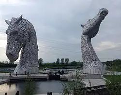 The Kelpies are a pair of monumental steel horse-heads between the Scottish towns of Falkirk and Grangemouth. They stand next to the M9 motorway and form the eastern gateway of the Forth and Clyde Canal, which meets the River Carron here. Each head is 30 metres (98 ft) high.
