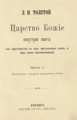 The Kingdom of God Is Within You (pre-reform Russian: Царство Божіе внутри васъ; post-reform Russian: Царство Божие внутри вас, romanized: Tsárstvo Bózhiye vnutrí vas) is a non-fiction book written by Leo Tolstoy. A Christian anarchist philosophical treatise, the book was first published in Germany in 1894 after being banned in his home country of Russia.[1] It is the culmination of 30 years of Tolstoy's thinking and lays out a new organization for society based on an interpretation of Christianity focusing on universal love.