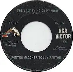 "The Last Thing on My Mind" was covered by Porter Wagoner and Dolly Parton and released as their debut duet single on October 30, 1967, by RCA Victor. Their version peaked at No.7 on the Billboard Hot Country Singles chart, the first of an almost uninterrupted string of top ten singles they would release over the next several years.