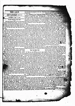 In 1848, The Lily developed as a publication for "home distribution" among the women who belonged to the Seneca Falls Ladies Temperance Society in response to their feeling marginalized by the larger temperance movement. Enthusiasm for the project quickly faded, however. Amelia Bloomer did not want to see the paper die, so she took on responsibility for editing and publishing the paper.[1][2] Bloomer's initial interest was not in women's rights, but in temperance, and this topic featured prominently in its early issues, even after the paper detached from the Temperance Society.[3] Bloomer believed that women writing in pursuit of reform was less unseemly than giving speeches or lectures.[1]