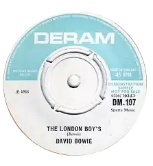 "The London Boys" is a song by the English musician David Bowie. It was first released as the B-side of the single "Rubber Band" in the United Kingdom on 2 December 1966. It was originally written and demoed in 1965 with the Lower Third for potential release as the artist's debut single for Pye Records but it was rejected. After a year of rewrites, he recorded a new version with a new band, the Buzz, which helped secure him a record contract with Decca-subsidiary Deram Records. Unlike the A-side, "The London Boys" retains the Mod feel of Bowie's previous singles. The dark lyrics concern a 17-year-old who leaves home for London and becomes embroiled in the Mod scene (the "London Boys" of the title), turning to pills to fit in.[2] Like his previous singles, it failed to chart. Decca later issued it as an A-side in 1975.
