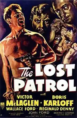The Lost Patrol is a 1934 American pre-Code war film by RKO, directed and produced by John Ford, with Merian C. Cooper as executive producer and Cliff Reid as associate producer from a screenplay by Dudley Nichols from the 1927 novel Patrol by Philip MacDonald. Max Steiner provided the Oscar-nominated score. The film, a remake of a 1929 British silent film,[2] starred Victor McLaglen, Boris Karloff, Wallace Ford, Reginald Denny, J. M. Kerrigan and Alan Hale.[Note 1]