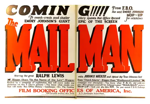 The Mailman is a 1923 American silent melodrama directed by Emory Johnson. FBO released the film in December 1923. The film's "All-Star" cast included Ralph Lewis, Johnnie Walker, and Virginia True Boardman. Emilie Johnson, Johnson's mother, wrote both the story and screenplay. The Mailman was the fourth film in Johnson's eight-picture contract with FBO.[1]