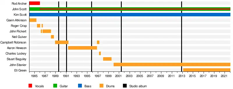 In March 2013 the band toured Australia with Eli Green on drums, sitting in for Stanier who was unable to tour due to his commitments with US band, Tomahawk. They completed further tours in 2014 and 2015, with Green on drums.[20] Rod Archer, their original vocalist until 1985, died of cancer on 26 February 2016.[21] In June 2015 the group had performed a benefit concert for Archer who was then undergoing chemotherapy.[22]