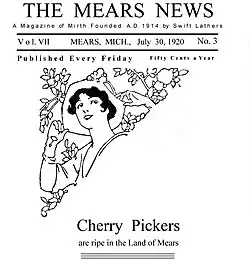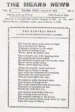 The Mears News[A] made its debut July 24, 1914. The Mears Newz was published by Swift Lathers, its founder and editor. Lathers worked as a stringer for a Detroit newspaper, he moved to Mears in 1909, and started The Mears News and reported on events in Mears. Lathers worked as reporter, writer, editor, printed the newspapers on a foot-operated printing press, and would hand deliver the newspapers locally.[1]
