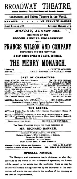 Presented by actor-manager Francis Wilson and his company, which also featured Marie Jansen, The Merry Monarch debuted on August 18, 1890, and ran for 49 performances, through October 4. Though this was not considered a long run for the time, the show was turning large profits, and crowds were being turned away from every performance. The New York Times reported on September 29 that the opera was sure to gross at least $87,000 during the run, "the largest amount by many thousands ever taken at the theatre in the same period at regular prices."[4] But the theatre had other contractual engagements that prevented a longer run,[5] and it was announced that the production would return the following fall. The opera immediately went on the road, also playing to packed houses.[6][7][8] The play returned after the long run of Wang concluded, and ran from October 5 through December 26, 1891, for 84 more performances. On the second run, a young Lulu Glaser served as the understudy for star Marie Jansen.[3] It may have run longer, but Wilson was anxious to bring out his next piece, The Lion Tamer, which immediately followed.