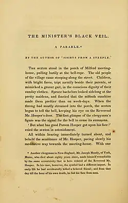 The story was published as "The Minister's Black Veil, a Parable" and credited "by the author of Sights from a Steeple" in The Token and Atlantic Souvenir for 1836; the issue also included Hawthorne's "The May-Pole of Merry Mount" and "The Wedding Knell".[2] It was later included in the collection Twice-Told Tales.