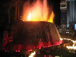 In 2005, the design firm WET was hired to begin planning an upgrade of the volcano.[59][61] The company spent two years developing a fire-shooting device for the revamped volcano.[157] It closed in February 2008, to allow for the $25 million upgrade to take place.[158] The volcanic structure, made of steel, was stripped down to receive a new exterior.[159] It reopened at the end of the year. The improved volcano shoots water 12 feet (3.7 m) high, while 120 flamethrower devices spout out flames on the lagoon. The attraction is choreographed to music by Mickey Hart and Zakir Hussain.[160][161] WET's redesign was inspired by the Fountains of Bellagio, another choreographed attraction by the company.[157]