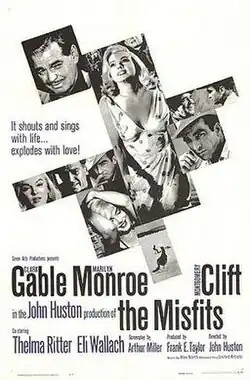 The Misfits is a 1961 American contemporary Western film directed by John Huston and written by Arthur Miller, based on his 1957 short story of the same name. The film stars Clark Gable, Marilyn Monroe, and Montgomery Clift, with supporting performances by Thelma Ritter and Eli Wallach. The narrative follows a recently divorced woman who becomes entangled in the lives of three men—an aging cowboy, his pilot-mechanic friend, and a quiet rodeo rider—while staying in Reno, Nevada.