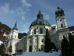The Ettal Monastery was founded in 1330 and received a written code of life in 1332 with the Ettal Rule, which was written in German and defined everyday life in the monastery. In addition to priests and monks, 13 knights and their wives were to live in the monastery.[46] If a knight died, his wife was allowed to remain in the monastery until her death.[47] The knights and their wives were allowed to go hunting and gamble, but not for money. Dancing and excessive consumption of alcohol were also forbidden,[48] children were not allowed to be brought into the monastery; children born in the monastery had to leave Ettal after the age of three. Clothing was to be simple and color-coded.[49] Knights were not allowed to have their own horses, but could borrow horses from the monastery's master.