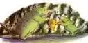 Dennis is a polite,[3] green, cave-dwelling reptilian monster that resembles a Velociraptor. As the main character of the story, he has many human-like features, such as smiling,[10] walking,[10] and emotion.[11] The monster has two objects he carries around with him, his teddy bear and pillow.[12] He is given these objects to give the reader an impression of a small child. Dennis also possesses several toys. These toys resemble the characters of another children's book, Where the Wild Things Are.[13] Dennis also plays hopskotch near his cave.[10]
