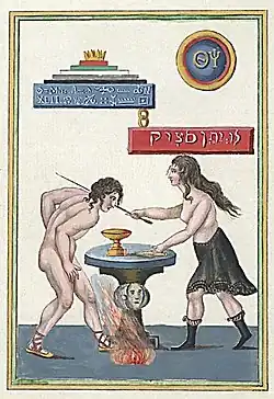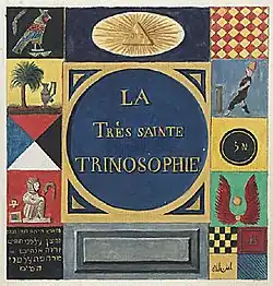 La Très Sainte Trinosophie, The Most Holy Trinosophia, or The Most Holy Threefold Wisdom, is a French esoteric book, allegedly authored by Alessandro Cagliostro or the Count of St. Germain.[1] Due to the dearth of evidence of authorship, however, there is significant doubt surrounding the subject.[2] Dated to the late 18th century, the 96-page book is divided into twelve sections representing the twelve zodiacal signs.[3] The veiled content is said to refer to an allegorical initiation, detailing many kabbalistic, alchemical and masonic mysteries. The original MS 2400 at the Library of Troyes is richly illustrated with numerous symbolical plates.