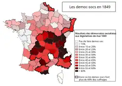 After 1848, the Odilon Barrot's Party of Order-backed government sought to repress protests against alcohol excises and the 45 centime land tax as well as demand for cheap credit and other grievances. The Democratic Socialists clandestinely organized this dissent in the face of press censorship, restrictions on political meetings and harassment. The Mountain's broader strategy was to prepare for the 1852 legislative and presidential elections by continuing to espouse its 'utopian' Christian socialist message alongside attempts to politicize the three million voters who had been disenfranchised in 1850 despite the Republic's constitution proclaiming universal manhood suffrage. Karl Marx again found cause for criticism, accusing The Mountain of impotently "prophesying future victories".[1] On the 1849 legislative election, there were more votes cast for The Mountain candidates than for Ledru-Rollin (Democratic Socialist) and Raspail (Socialist) combined in the 1848 presidential election.[2]