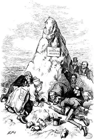 The fable was also annexed to the satirical work of political cartoonists. The agitation that greeted the British Roman Catholic Relief Act in 1829 was satirised in a contemporary print by Thomas McLean (1788–1875) with the title "The Mountain in Labour – or much ado about nothing".[36] In the United States several presidential nominees were made the butt of such cartoons,[37][38][39] as were attempts to quell the disturbances preceding the Chinese Exclusion Act of 1882.[40] In France the fable's title was applied to the parliamentary policy of Louis Philippe[41] and to the foreign policy of Napoleon III.[42]