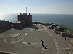 There were subsidence problems and concerns that the concussion from firing the guns was causing the cliffs to crumble. This was solved by building the New Battery higher up the cliff, at a height of 120 metres above sea level. The New Battery was completed in 1895. Three 9.2-inch Mk IX breech-loading guns were installed at the New Battery: two in 1900 and a third in 1903. A crew of 11 was required to fire one of these guns. Each shell weighed 380 pounds (172 kg).[6] The New Battery guns remained in place until 1954, when they were scrapped.[6]