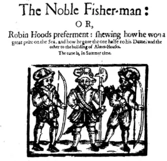The Noble Fisherman, also known as Robin Hood's Preferment and Robin Hood's Fishing, is a 17th-century ballad of Robin Hood. Unusually, it depicts Robin Hood as a hero of the sea, rather than his usual portrayal as someone who operated in the greenwood forest. It seems to have been quite popular for the first two centuries of its existence, although it eventually lost prominence and was less used in adaptations of Robin Hood from the 19th and 20th centuries. It was later published by Francis James Child in the 1880s as Child Ballad #148 in his influential collection of popular ballads.[2][3][4]