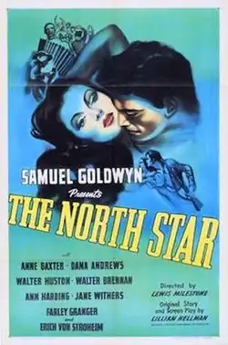 The North Star (also known as Armored Attack in the US) is a 1943 pro-resistance war film starring Anne Baxter, Dana Andrews, Walter Huston, Walter Brennan and Erich von Stroheim It was produced by Samuel Goldwyn Productions and distributed by RKO Radio Pictures. It was directed by Lewis Milestone, written by Lillian Hellman and featured production design by William Cameron Menzies. The music was written by Aaron Copland, the lyrics by Ira Gershwin, and the cinematography by James Wong Howe. The film also marked the debut of Farley Granger.