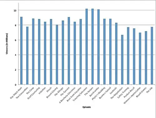 The third-season premiere "Gay Witch Hunt" received a 5.7/9 in the Nielsen ratings, meaning that on average 5.7 percent of households were tuned in at any given moment and 9 percent of all televisions in use at the time were tuned into the program.[12] The premiere was watched by 9.1 million viewers, and marked a slight increase from the second season premiere "The Dundies".[12][13] At the onset of the season, the show began to eclipse the viewership of its lead-in program, My Name Is Earl.[14] The season hit a low with the nineteenth episode "The Negotiation", which was viewed by 6.74 million viewers.[13] The season finale, "The Job" was viewed by 7.88 million viewers, also an increase from the second-season finale "Casino Night".[13] By the end of the 2006–07 season, it placed 68th, a one-place slip from the previous season. Despite this, the show's third season was slightly more watched than the previous: it averaged 8.3 million viewers, and scored a 4.1/11 in the Nielsen ratings, meaning that on average 4.1 percent of households 18–49 years old were tuned in at any given moment and 11 percent of all televisions in use at the time were tuned into the program. The series also ranked as the 28th-most watched series in the 18–49 demographic.[15]