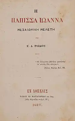 The Papess Joanne (Greek: Ἡ Πάπισσα Ἰωάννα, romanized: Hē Pápissa Iōánna) is a 1866 novel by Greek writer Emmanuel Rhoides. Published with the subtitle "medieval study",[a] the novel is an exploration of the European legend of Pope Joan, a woman who allegedly ascended the church hierarchy and reigned as pope in disguise some time in the late 9th century. Though a romance with satirical overtones, it has been described as having elements of a chronicle because of the writer's extensive research of historical sources.[1] Due to its religious commentary, the novel attracted criticism from the Greek Orthodox Church which resulted to its excommunication by the Holy Synod. The Papess Joanne became the most famous of Rhoides' works and has been established as a classic of Modern Greek literature; It got translated into several languages, earning Rhoides international recognition and praise.[2][3][4]