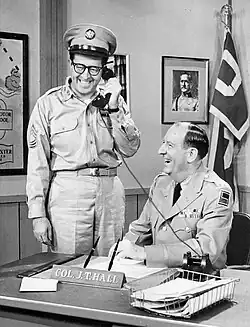 While Bilko's soldiers regularly helped him with his schemes, they were just as likely to become "pigeons" in one. Nevertheless, Bilko exhibited an odd paternalism toward his victims, and he would doggedly shield them from all outside antagonists. The sergeant's attitude toward his men has been described thus: "They were his men and if anyone was going to take them, it was going to be him and only him."[6] Through it all, the platoon was generally loyal to Bilko, despite their wariness of his crafty nature, and they would depend on him to get them out of any military misfortune. If one of his boys was treated unfairly or was cheated in any way, Bilko always helped the injured party, using the same psychological guile and chicanery he used to outwit his suckers. This benevolent side of Bilko was toned down in the series's later seasons (with scripts, significantly, by different writers); Bilko became strictly mercenary, willing to swindle anyone for a fast buck.