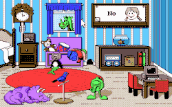 The Playroom featured Pepper Mouse and is set in his playroom. Clicking on toys and areas of the playroom will activate animated surprises or open an activity.[5] Activities include the spinner, a simple counting game with four difficulty levels; an ABC book, where objects can be placed on two different scenes; the computer, which teaches spelling and becoming familiar with the keyboard; the cuckoo clock, which shows how to tell time; the mousehole game, which is a dice-rolling game with three skill levels; and the mix-up toy, where heads, torsos and legs from various characters can be customised.[6] The 1995 remake includes additional content to the existing activities[7] and the presence of Pepper's sister Ginger.