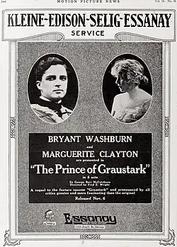 The Prince of Graustark is a 1916 American silent romantic drama film directed by Fred E. Wright and starring Bryant Washburn, Marguerite Clayton and Sidney Ainsworth.[1] Produced by the Chicago-based Essanay Pictures, it is based on the 1914 novel of the same title by George Barr McCutcheon. Future star Colleen Moore made her screen debut in an uncredited role as a maid.