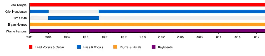 The balding keyboardist Wayne Famous had the goofy, comedic stage presence to contrast with the other rock stars in the band, similar to Rick Nielsen of Cheap Trick.[1] Years ahead of the keytar, he modified the keyboard of an Oberheim OB-X with straps to hold it around his neck allowing him to perform and dance center stage. His own invention, he used an umbilical cable to communicate with the remaining electronics off stage, frequently repairing his contraption on stage.