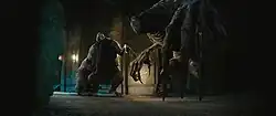 The main feature of this work's VFX is the monsters. Yasuki Miyano one of the production members was the one who undertook everything from the designs to asset production and even shot sculpting. At first, he started production with reference to the original manga. During the work, sketches drawn by the original author when writing the manga were provided as additional materials, and a concept model was created. They planned to make four monsters, but in the end they decided to make three from the viewpoint of balancing cost and quality. The production includes the creation of the background concept, from the concept design of the monsters to the modeling, to the final product. In addition to the gate and pillars, the Grace Field House is also added using CGI. The gate is made in Cinema 4D and rendered using Redshift, the inside of the gate also uses a lot of CGI as an addition to the set. Because of the budget, they were only able to build the first floor of the set, so they used Cinema 4D to make up for the shortfall.[17]