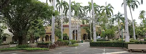 The Quadrangle (Spanish: El Cuadrángulo) is the heart and main quadrangle of the University of Puerto Rico, Río Piedras. Together with the Roosevelt Tower (La Torre), it is listed on the National Register of Historic Places and the Puerto Rico Register of Historic Sites and Zones as the University of Puerto Rico Tower and The Quadrangle, for its unique history which represents the union between Puerto Rican architecture with the Jeffersonian Neoclassical style often seen in American universities.[2][3] It is famous for its lines of Puerto Rican royal palm (Roystonea borinquena) or palma real and the architecture of its surrounding buildings.[4]