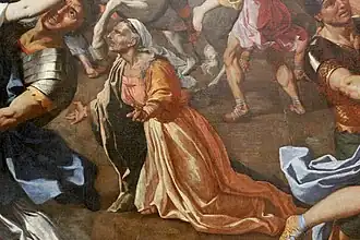 - ^ In the right of the foreground, the Roman warrior's violently twisted pose and defined musculature are emphasised by his form-fitting lorica—perhaps anachronistic in its golden colouring, but balancing with the blue of the Sabines' rumpled garments.[13] He brandishes an upraised blade, resembling a rondel dagger or stiletto.