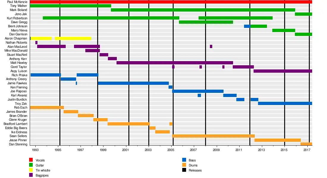 The band released their debut album, "the Real McKenzies" in 1995, a cheeky collection of short punky originals, interspersed among celtic classics, & deeply tongue-in-cheek, punk-infused covers like "My Bonny", "Pliers" (Jimi Hendrix's "Fire"), "Kilt" (Alberto y Lost Trios Paranoias's "Kill"), and "Outta Scotch" (the Pointed Sticks's "Outta Luck"). Their 1998 follow up Clash of the Tartans popularized Scottish-Canadian punk-rock, with solid singles "Thistle Boy", "Pagan Holiday", "Mainland", "Kings O' Glasgow", & the old celtic classic "Wild Mountain Thyme".[3] Frontman Paul McKenzie claims as many as 100 different musicians have performed as members of the band,[4] including (now-deceased) bassist Rich "Rock" Priske (Matthew Good Band, Bif Naked; drummer Glenn "McKruger" Kruger (Bloody Chicletts, the Paperboys, Mudgirl, Carly Rae Jepsen); & piper Alan "Raven" MacLeod, of the pioneering '70s Scottish folk band The Tannahill Weavers, and 90s duo Bourne and MacLeod. In 2012, they delved deeper into covering songs from popular Canadian singer-songwriter Stan Rogers with their version of "Barrett's Privateers" appearing on their album Westwinds.