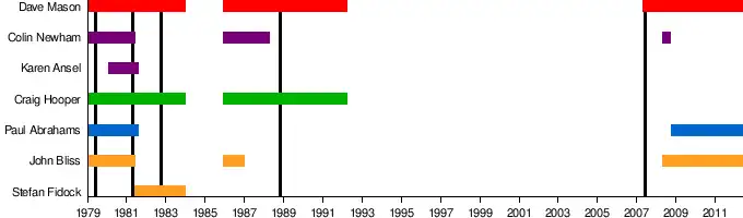 Past members | Karen Ansel Craig Hooper Stefan Fidock Colin "Polly" Newham Dave Mason John Bliss Paul Abrahams |