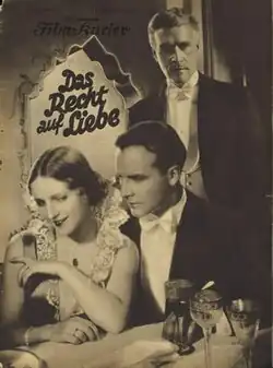 The Right to Love (German: Das Recht auf Liebe) is a 1930 German silent drama film directed by Jacob Fleck and Luise Fleck and starring Georg Alexander, Evelyn Holt, and Georgia Lind. The film addresses the issue of the rights of ex-soldiers made impotent by war wounds to get married.[1] It is in the Weimar tradition of films addressing topics of sexual education.