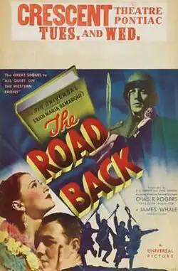 The Road Back is a 1937 American historical drama war film directed by James Whale, starring John King, Richard Cromwell, and Slim Summerville with a supporting cast featuring Andy Devine, Louise Fazenda, Noah Beery Jr., Lionel Atwill, Spring Byington, Al Shean, and an uncredited Dwight Frye. The screenplay is by Charles Kenyon and R. C. Sherriff from the 1931 novel of the same name by Erich Maria Remarque.[2] Combining a strong anti-war message with prescient warnings about the rising dangers of the dictatorship of Nazi Germany, it was intended to be a powerful and controversial picture, and Universal entrusted it to their finest director, James Whale.[3]