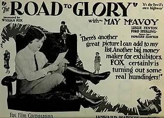 The Road to Glory is a 1926 American silent drama film directed by Howard Hawks and starring May McAvoy, Leslie Fenton, and Ford Sterling.[1][2] This was Hawks' first film, based on a 35-page treatment that Hawks wrote. It is one of only two Hawks works that are lost films.