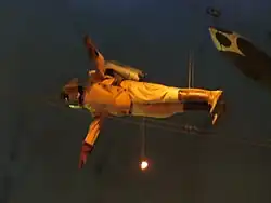 A funfair ride in Germany called "Commander" prominently features the design and aesthetics inspired by The Rocketeer.[62][63] The "Commander" is a high-energy pendulum ride (Mondial Shake R5), where riders are seated in a circular gondola that swings back and forth while spinning around its axis. The ride incorporates elements such as the jetpack motif, art deco styling, and aviation-themed imagery, paying homage to the film's iconic visual language.