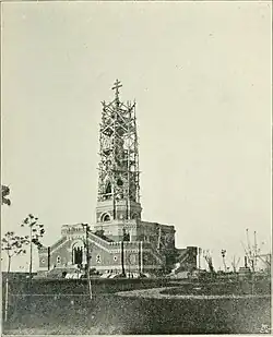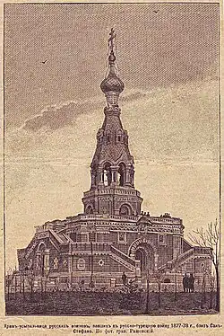 The Russian Monument at San Stefano was built to honor the Russian soldiers who died in the Russo-Turkish War of 1877-1878.[1] Covering six acres, it stood on a hill overlooking San Stefano (now Yeşilköy, a neighborhood of Istanbul) and combined elements of Orthodox church architecture with a militaristic commemorative style. Its construction began in 1895, being completed in 1898. The structure featured a crenelated wall. It was built from grey rough-dressed granite, accented with white French stone. At its base lied a charnel house where the remains of 5,000 Russian soldiers were interred. Above this, a chapel was crowned with a campanile and a towering spire.[2] The main entrance was adorned with a painting of Christ, flanked by images of Vladimir the Great and Alexander Nevsky.[3] While its exact designer remains uncertain, Russian sources attribute the monument to Vladimir Sulsov, whereas Turkish records mention an architect named "Bozarov".[2]