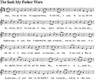 "The Sash" (Roud 4796) also known as "The Sash My Father Wore") is a ballad from Northern Ireland commemorating the victory of King William III in the Williamite War in Ireland in 1690–1691. The lyrics mention the 1689 Siege of Derry, the 1689 Battle of Newtownbutler near Enniskillen, the 1691 Battle of Aughrim, and the 1690 Battle of the Boyne. It is popular amongst Ulster loyalists and many other unionists in Northern Ireland, it also remains a popular folk ballad in parts of Ireland and Scotland .