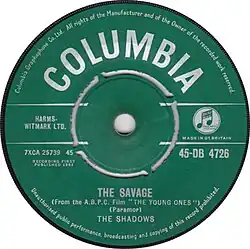 "The Savage" was released as a "double-sided hit" with "Peace Pipe".[3] Both songs were written and produced by Norrie Paramor and the single was released to promote the film The Young Ones, which starred Cliff Richard.