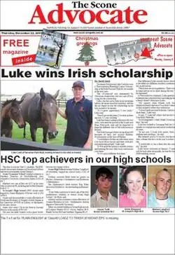The Scone Advocate is an Australian local newspaper, serving the communities of Scone, Aberdeen and Murrurundi in the Upper Hunter Valley. It is owned by Australian Community Media, and goes on sale each Thursday for $1.40. The newspaper was founded in 1887, the same year Scone was declared a municipality.