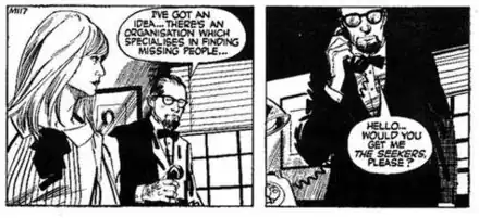 The Seekers began publication on 2 May 1966 in The Daily Sketch.[1][2] The concept of the strip bears some resemblance to another strip Burns later drew for a brief period, Modesty Blaise. The female characters were consistently drawn in an enticing manner, indicating Burns' evident intent to challenge the limits of the daily British newspaper strip conventions of the times.[1] The initial writer Les Lilley was succeeded by Phillip Douglas starting with episode 14, The Missing Golfers, occasionally aided by Dick O'Neil, who wrote one story, The Curse of the One-Eyed Sailor.