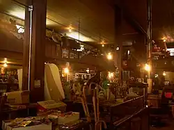 A fire destroyed the original store building in 1926, but it was rebuilt in the same year using brick instead of wood, of which the original store was built.[2] The current building is two stories tall with a porch on the front (south) facade. A wood awning covers the porch and is suspended by cables which attach to the front of the building. The roof is flat, bordered by a parapet wall, which is capped with a concrete belt that peaks in the center. The interior contains many wood shelves and glass showcases in which merchandise is displayed and stored. The second floor contains a wrap-around balcony, which is accessed via a staircase in the rear of the building. The entire store is open except for an office room in the back of the first floor and a closet on the second floor.[4] There is a wood-burning stove on the first floor for heating during the winter, and though there is no air conditioning in the building, there are fans throughout the building for use during the summer heat.[3]