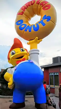 A large portion of the World Expo area at Universal Studios Florida and a portion of the Upper Lot at Universal Studios Hollywood were converted into a new themed area called Springfield (although Florida's version of Springfield would actually be a subsection of World Expo until 2016), based on iconic landmarks from The Simpsons such as Krusty Burger, Frying Dutchman, Lard Lad Donuts, Moe's Tavern, and a Duff Brewery. The park also added one amusement ride named "Kang & Kodos' Twirl 'n' Hurl", a Dumbo-esque spinning ride where patrons drive flying saucers around Kodos' head and attack Springfield residents.[33]