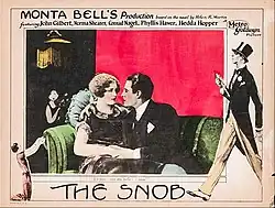 The Snob is a 1924 American silent drama film directed by Monta Bell. The film starred Norma Shearer and John Gilbert (prior to their stardom), together with Phyllis Haver, Conrad Nagel, and Hedda Hopper.[1] The film was written by Monta Bell, and was based on the novel The Snob: The Story of a Marriage by Helen Reimensnyder Martin.[2]