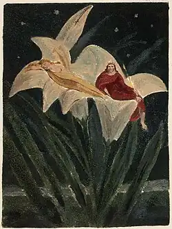 During autumn 1790, Blake moved to Lambeth, Surrey. He had a studio at the new house that he used while writing what were later called his "Lambeth Books", which included The Song of Los in 1795. Like the others under the title, all aspects of the work, including the composition of the designs, the printing of them, the colouring of them, and the selling of them, happened at his home.[2] Early sketches for The Song of Los were included in a notebook that contained images were created between 1790 until 1793.[3] The Song of Los was one of the few works that Blake describes as "illuminated printing", one of his colour printed works with the coloured ink being placed on the copperplate before printed.[4]