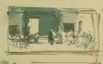 The Spanish Wedding was painted from 1868 to 1870.[1] It was started in Rome and completed when the artist moved to Paris.[1] Fortuny's working style is characterized by extensive research.[10] Many test sketches and watercolors survive.[11] These practice works show Fortuny's artistic process.[12] Each sketch becomes more sophisticated, and refines his extensive research, prior to putting brush to canvass.[12] Fortuny was known for using family and friends, as well as professionals, as models for his paintings.[13] In The Spanish Wedding, his wife, Cecilia de Madrazo, and sister in law, Isabel de Madrazo, daughters of Federico de Madrazo the director of the Museo del Prado, modeled for the painting, as well as the artist, Jean-Louis-Ernest Meissonier.[14]